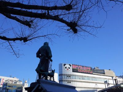 パンダの顔を見つめる西郷隆盛像(著者撮影)