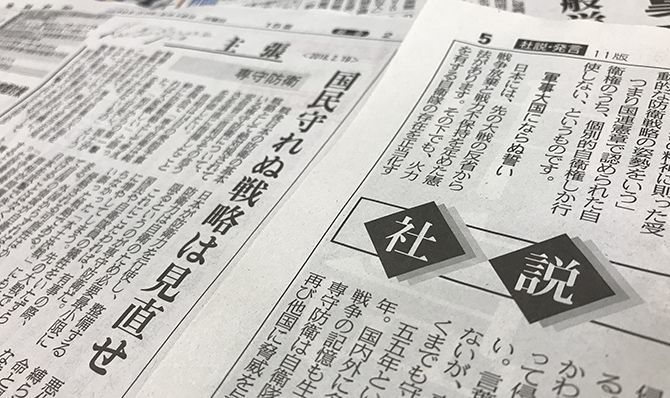 2月19日付の産経新聞と東京新聞が同時に「専守防衛」をテーマに社説を書いた。2紙のスタンスは正反対だ。産経社説が安倍首相を褒めつつ貶すという忙しい論を展開する一方で、東京社説は「自衛隊が保有する防衛装備の『質』も変化しつつあります」と「です・ます」調で懸念を示す。日本はどちらに進むべきなのか――。