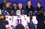 女子アイスホッケー南北合同チームを激励する金与正氏(上段一番右)と文在寅氏(上段一番左)。(時事通信フォト=写真)