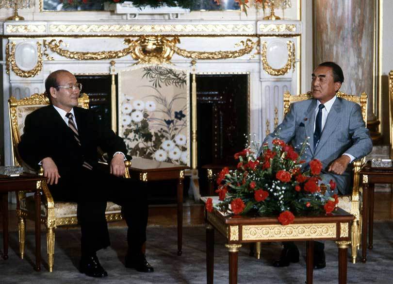 1984年9月、韓国の大統領として初めて来日し、中曽根康弘首相(当時)と日韓首脳会談に臨む全斗煥。(写真=Fujifotos/アフロ)