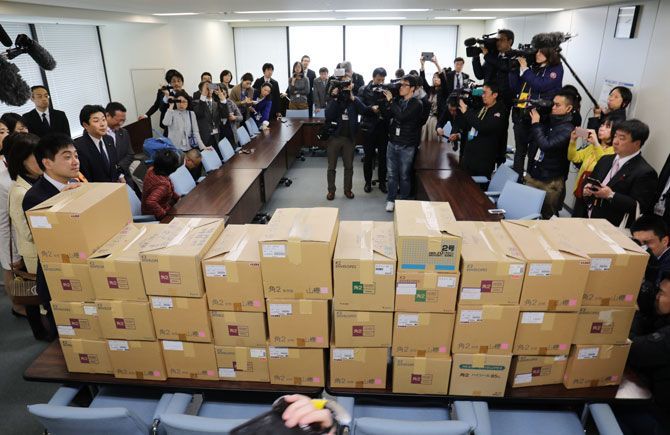 2018年2月23日、厚生労働省の地下倉庫に保管されていた裁量労働に関する調査票が入った段ボール箱(写真=時事通信フォト)