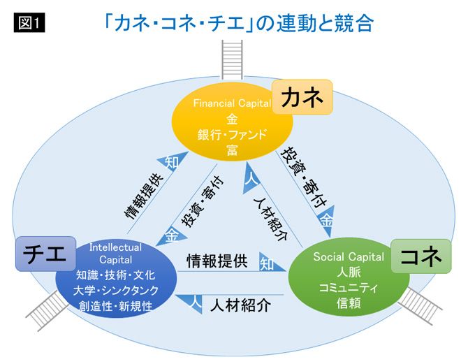 図1:「カネ・コネ・チエ」の連動と競合