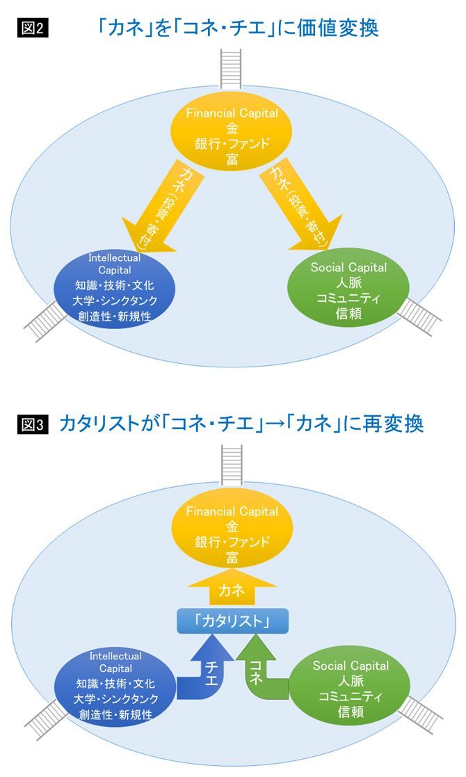 図2:「カネ」を「コネ・チエ」に価値変換/図3:カタリストが「コネ・チエ」→「カネ」に再変換