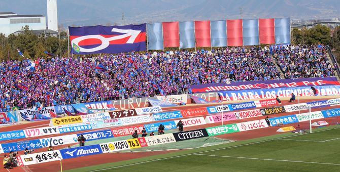 「山梨中銀スタジアム」にはスポンサーの看板がたくさん並べられている