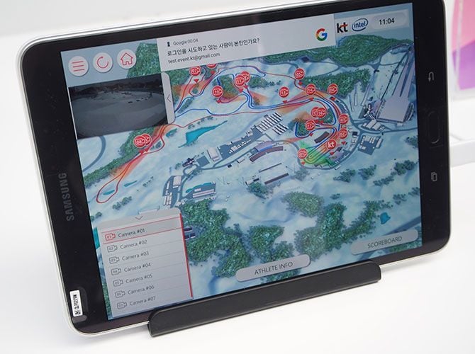 KTと共同開発のサムスンの5Gタブレット。デモ機だからか、かなり厚みがある。画面はオムニビューの一部。