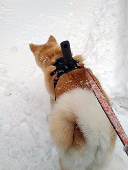 背中にはリコーのカメラを装着。老犬神社の「シロ」の気配を感じているのかどこか神妙な表情の「あこ」。