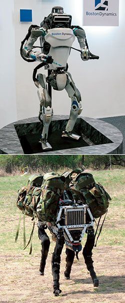 ボストン・ダイナミクスが開発した、アトラス(左)とビッグドッグ(右)。(AFLO=写真)
