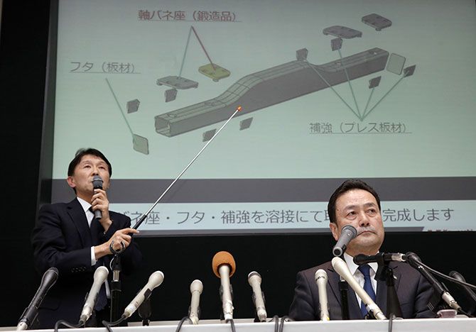 2018年2月28日、東海道新幹線の台車に亀裂が見つかった問題について説明する川崎重工の小河原誠常務取締役(左)。右は金花芳則社長。(写真=時事通信フォト)