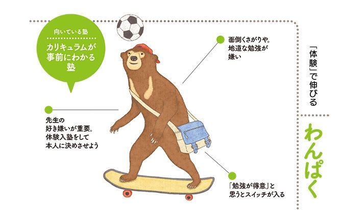 *「わんぱくタイプ」の子は事前にカリキュラムがわかる塾が向いている。各タイプの詳細な解説は『プレジデントムック 塾 習い事選び大百科 2018完全保存版』に記載されている。イラスト=浜野史子(以下、同)。