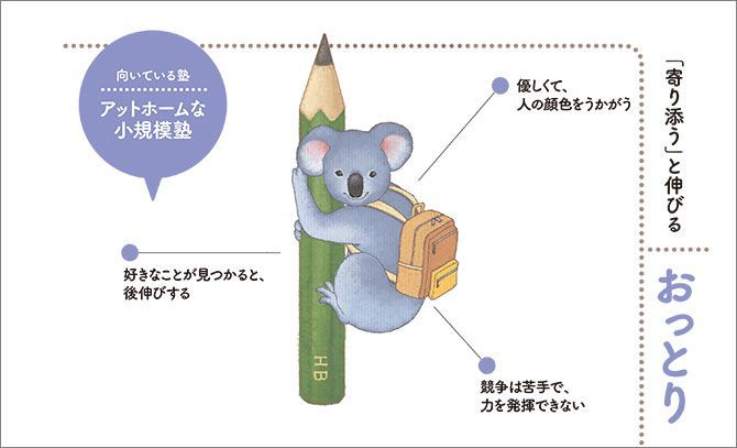 *「おっとりタイプ」の子はアットホームな小規模塾が向いている(同上)イラスト=浜野史子。