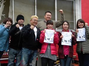 被災したプレミアム店の前で、復興支援に訪れたサンドウィッチマンとともに。中央後方が小野寺氏(オノデラコーポレーション提供)