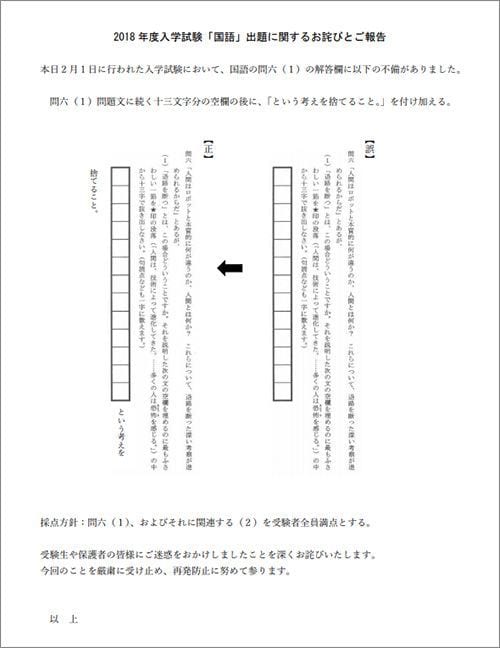 武蔵中学のウェブページに掲載されている「2018年度入学試験『国語』出題に関するお詫びとご報告」。国語の問六(1)の解答欄の不備に関する説明。