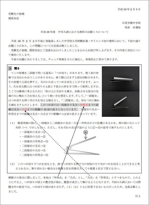 広尾学園中学のウェブページに掲載されている「理科の出題ミスについて」。「本来は『作用点』を『力点』とし、『力点』を『作用点』とすべきもの」「問題文中の設定では、つめ切りの図が成り立たず」と説明。