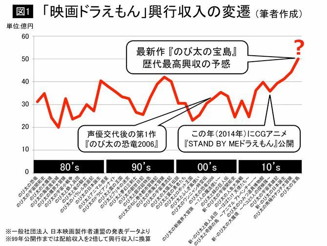 図1:「映画ドラえもん」全38作の興行収入の変遷