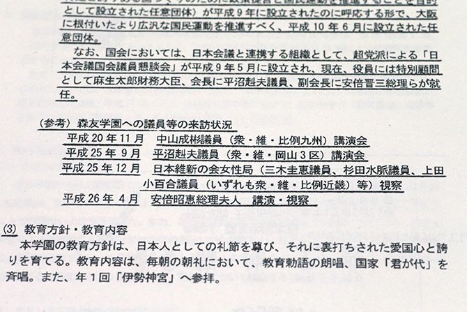 財務省が公表した書き換え前の文書。中山成彬衆院議員、平沼赳夫衆院議員、日本維新の会の各議員、安倍昭恵首相夫人らの記述がある(下線部分)が、書き換え後は削除されていた。(写真=時事通信フォト)