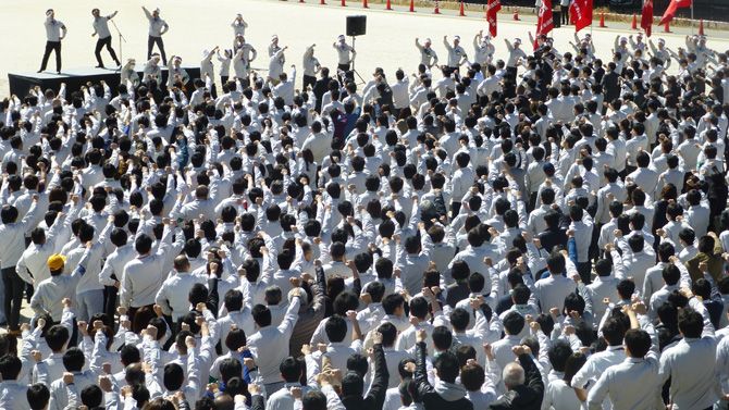 2018年3月6日、春闘集会で気勢を上げるトヨタ自動車労働組合の組合員(写真=時事通信フォト)