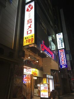 「三代目鳥メロ 新宿御苑前店」の外観。平日夜7時頃店の外からのぞくと、店内は賑わっている様子だった。(編集部撮影)