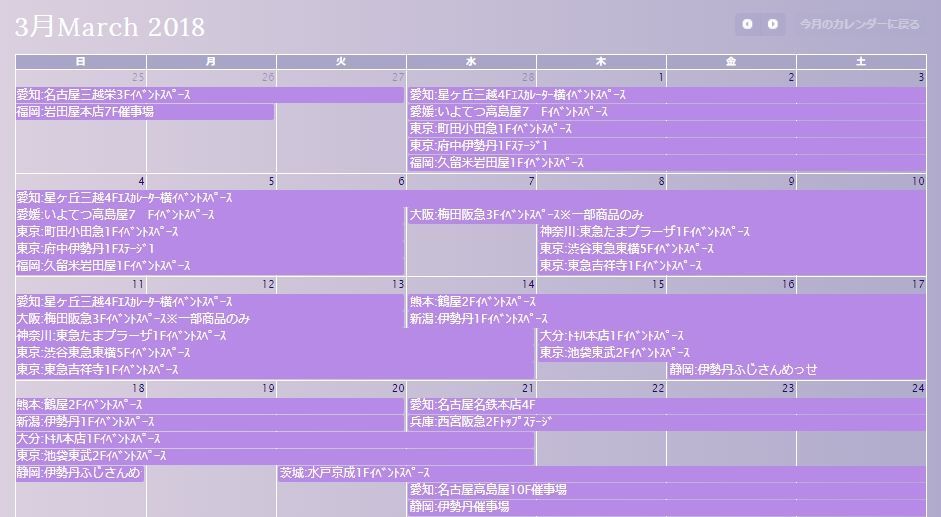「ファルファーレ」のウェブサイトにある催事予定。ほぼ毎週、全国の百貨店で展開している。