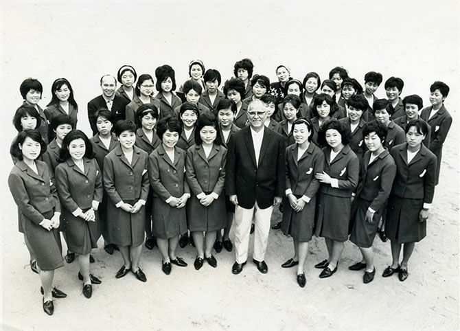 中村豊を囲むフラガール1期生と当時の従業員たち(写真=常磐興産)