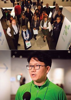 (上)福島県環境創造センターを回る海外の赤十字メンバー。(下)韓国の赤十字メンバーの金宰律さん。