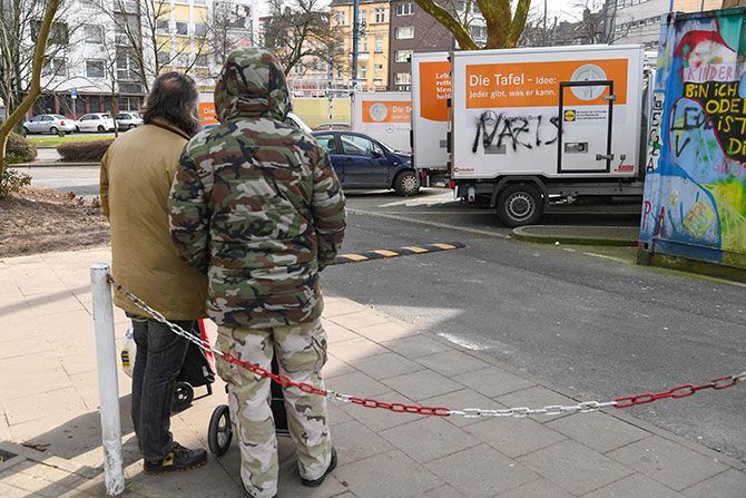 ドイツの社会は、政治家やマスコミ、大手企業の経営者が見ようとしない「不都合な真実」に囚われている――トラックや入り口に「ナチ」と落書きされたエッセンの「ターフェル」の前で、食料の配給開始を待つ人々(写真=AFP/時事通信フォト)