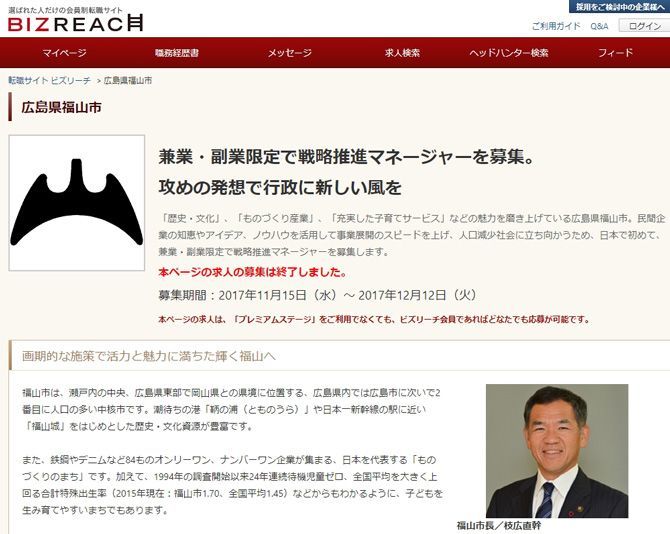 転職サイト「ビズリーチ」での募集ページ。現在は募集は終了している。