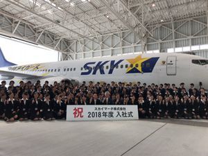 スカイマークが神戸空港で開いた入社式の様子。中央がスカイマークの佐山会長。(撮影=三宅玲子)
