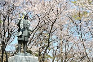 春の浜松城公園に建つ徳川家康像(写真提供:浜松観光コンベンションビューロー)