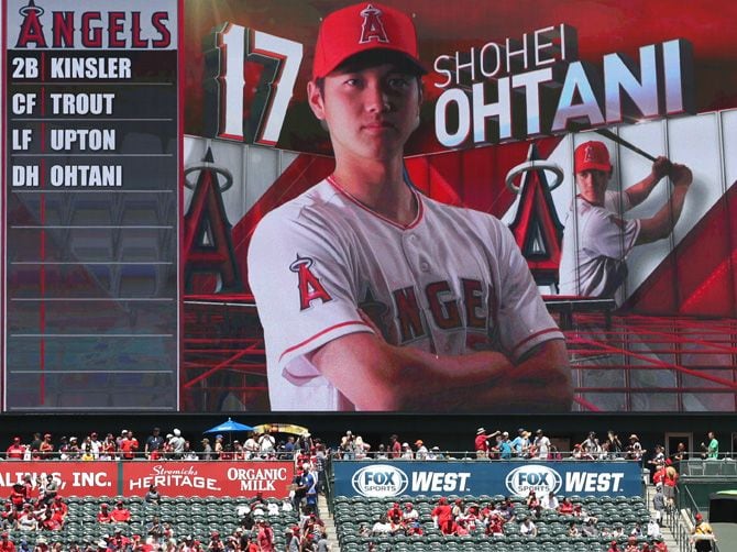 2018年4月22日、ジャイアンツ戦にエンゼルスの大谷翔平が4番DHで出場することを伝える電光掲示板(写真=時事通信フォト)