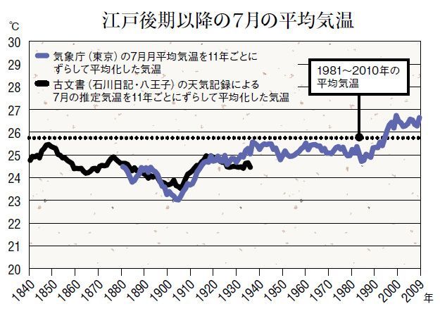 江戸~東京の気温が緩やかに右肩上がりのトレンドを描いていること、1990~2000年の上昇は過去30年の平均気温を上回って顕著になっていることが見て取れる(財城真寿美氏・三上岳彦氏作成)