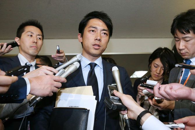 2018年4月13日、自民党総務部会終了後、記者団の質問に答える小泉進次郎筆頭副幹事長。世論調査では「次の総裁」としても名前があがる。(写真=時事通信フォト)