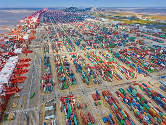 米中貿易戦争に発展すれば、世界貿易縮小のリスクが高まる(膨大案物資が行き交う上海ヨウジョウ深層水港)