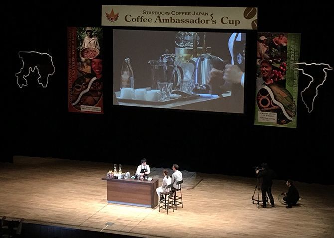 2月22日に開催された「コーヒーアンバサダーカップ」。壇上に17人の"ブラックエプロン”が並ぶ。(編集部撮影)