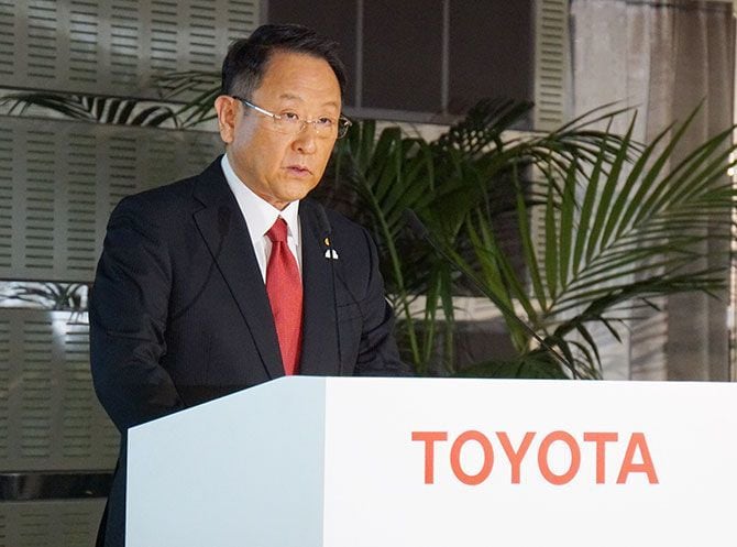 2018年5月9日、決算会見でスピーチをするトヨタ自動車の豊田章男社長(撮影=安井孝之)