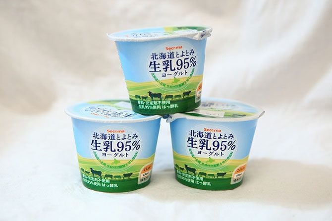 セイコーマートで販売されている「北海道とよとみ生乳95%ヨーグルト(80g×3個パック)」(編集部撮影)