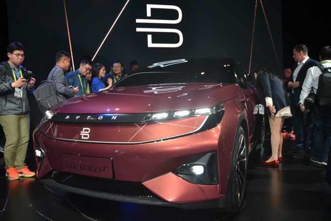 2018年1月、アメリカの家電見本市で、中国の新興自動車メーカー、フューチャー・モビリティーが世界初公開した電気自動車(EV)ブランド「BYTON(バイトン)」のコンセプト車。(写真=時事通信フォト)