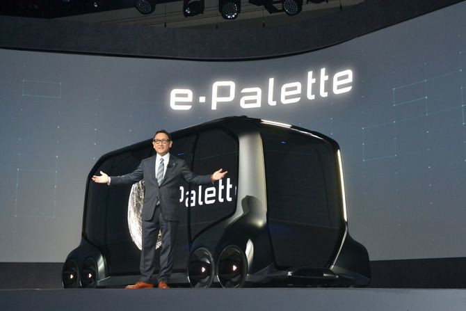 CES2018で自動運転機能を備えた商用電気自動車(EV)のコンセプト車「eパレット・コンセプト」を披露するトヨタ自動車の豊田章男社長(写真=時事通信フォト)
