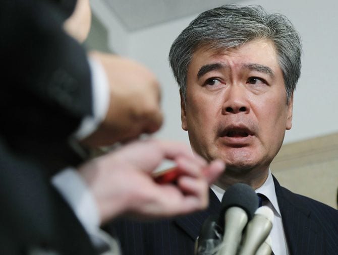 2018年4月18日、辞任を表明し、報道各社の取材に答える福田淳一財務事務次官(当時)(写真=時事通信フォト)