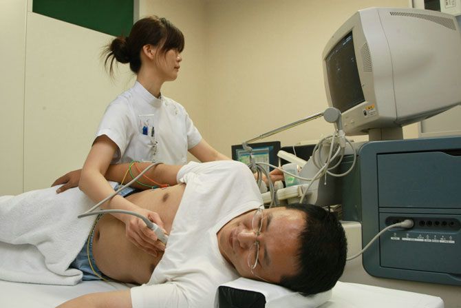 2010年12月、南海電鉄が企画した予防医療健診ツアーの体験会で心臓の検診を受ける中国人参加者(大阪・岸和田市の岸和田徳洲会病院)。(写真=時事通信フォト)