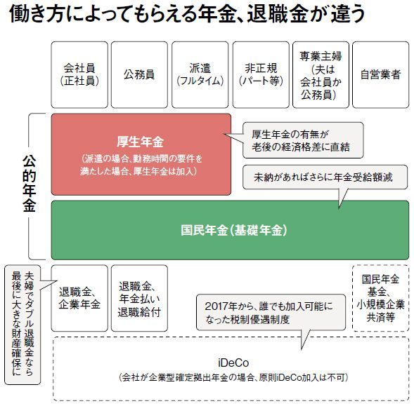 「公的年金」は、国が運営する強制加入制度。「厚生年金」は、基礎年金に上乗せする形で支給される。公的年金以外には、確定拠出年金(401k)や確定給付年金などの「企業年金」、個人型確定拠出年金(iDeCo)や国民年金基金など自分の意思で加入できる年金がある。