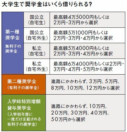 日本学生支援機構奨学金の貸与額。第一種、第二種奨学金の数字は月額。入学時特別増額貸与奨学金も、支給は入学後になる。