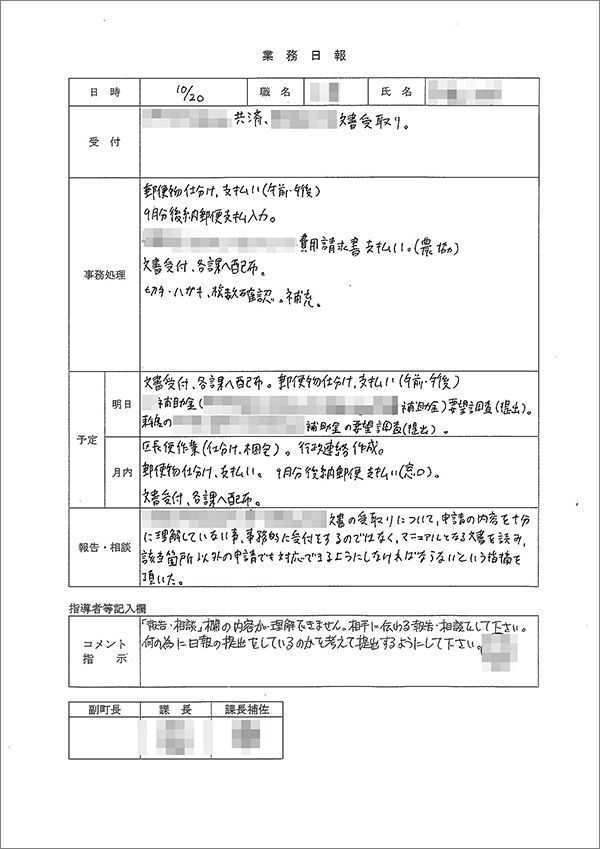 業務日報(11月6日)。プライバシー保護のため一部を加工している。