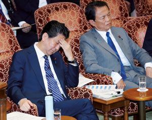 不祥事は支持率にボディーブローのように効いていく(安倍首相と麻生太郎財務相)。(AFLO=写真)