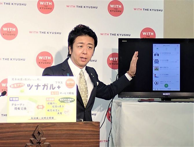 2018年4月11日、福岡市などが開発した防災アプリを説明する高島宗一郎市長(写真=時事通信フォト)