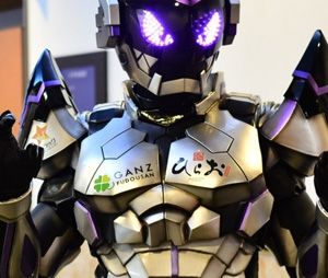 扉の外で出番を静かに待つヤバイ仮面。右手前はガンツ不動産のマスコットキャラ「たねぱん」(後ろ姿)