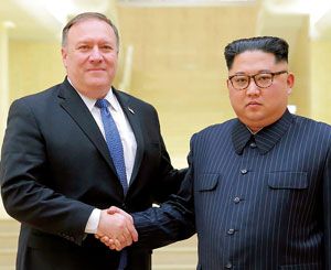 訪朝したポンぺオ米国務長官と握手を交わす金正恩委員長(18年5月9日)。(AFLO=写真)