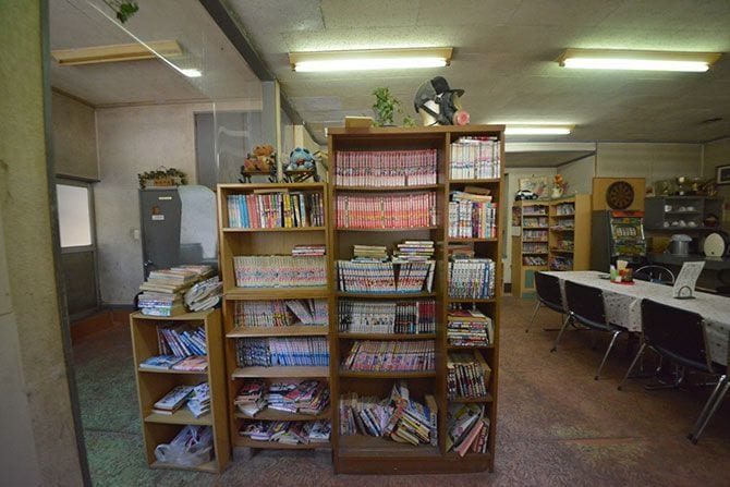 ドライブインといえばマンガがつきもの。ドライブイン峠の本棚には、西村さんご夫婦のお子さんたちが読み終えた漫画が置かれている。