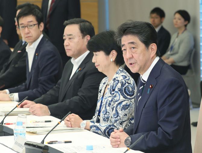 2018年6月4日、規制改革推進会議で発言する安倍晋三首相(手前)。手前から2人目は議長の大田弘子政策研究大学院大教授(写真=時事通信フォト)