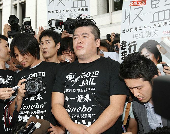 ライブドア(当時)の粉飾決算事件で証券取引法(現金融商品取引法)違反に問われ、実刑が確定。東京高検へ出頭する直前、報道陣や支援者らに心境を語る堀江貴文元社長(中央)(写真=時事通信フォト)