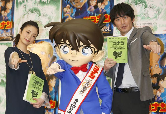 2018年3月20日、『名探偵コナン ゼロの執行人』の公開アフレコを行う上戸彩さんと博多大吉さん(写真=時事通信フォト)